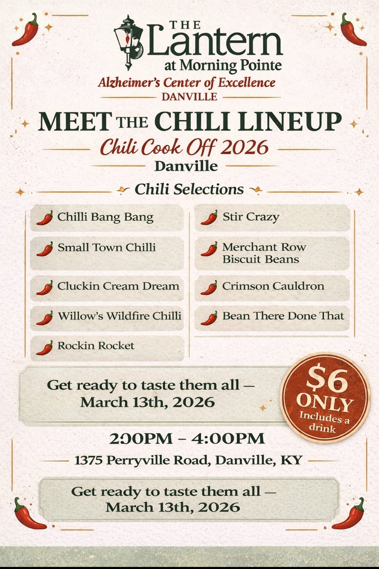 The Lantern at Morning Pointe Danville, part of the full-service Morning Pointe Senior Living campus, is hosting a Chili Cook Off on Friday, March 13 from 2:00–4:00 p.m. Local cooks are invited to compete for free, with trophies and prize baskets awarded to first, second, and third place. Only 10 competition spots are available, and each chili must have a creative name. Community members are invited to attend, sample the entries, and vote for their favorite for $6 per person. To reserve a competition spot, call 859-965-1008.